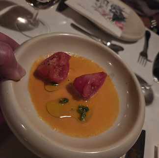 There were a variety of different influences in the dishes. The soup consisted of two types of tomato water combined with chilli water and served over a dark bread. The bread was amazingly different. So full of flavour and had an amazing texture... it almost could have fooled you that it was meat. The recipe for this was inspired by the chefs abuela (grandma) from Spain.
